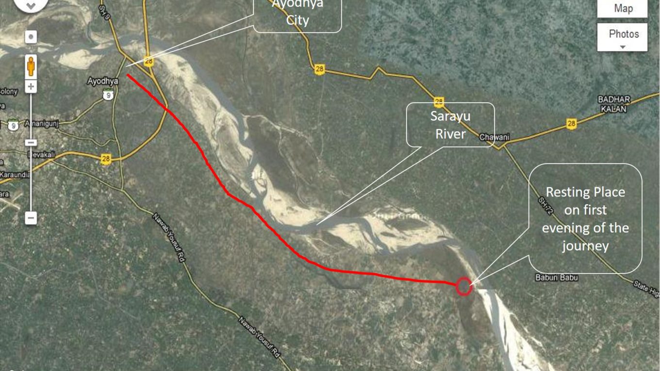 And on going one and half yojana distance Vishvamitra addressed Rama in a harmonious voice calling, ‘oh, Rama’, on the southern riverbank of Sarayu. 1-22-10